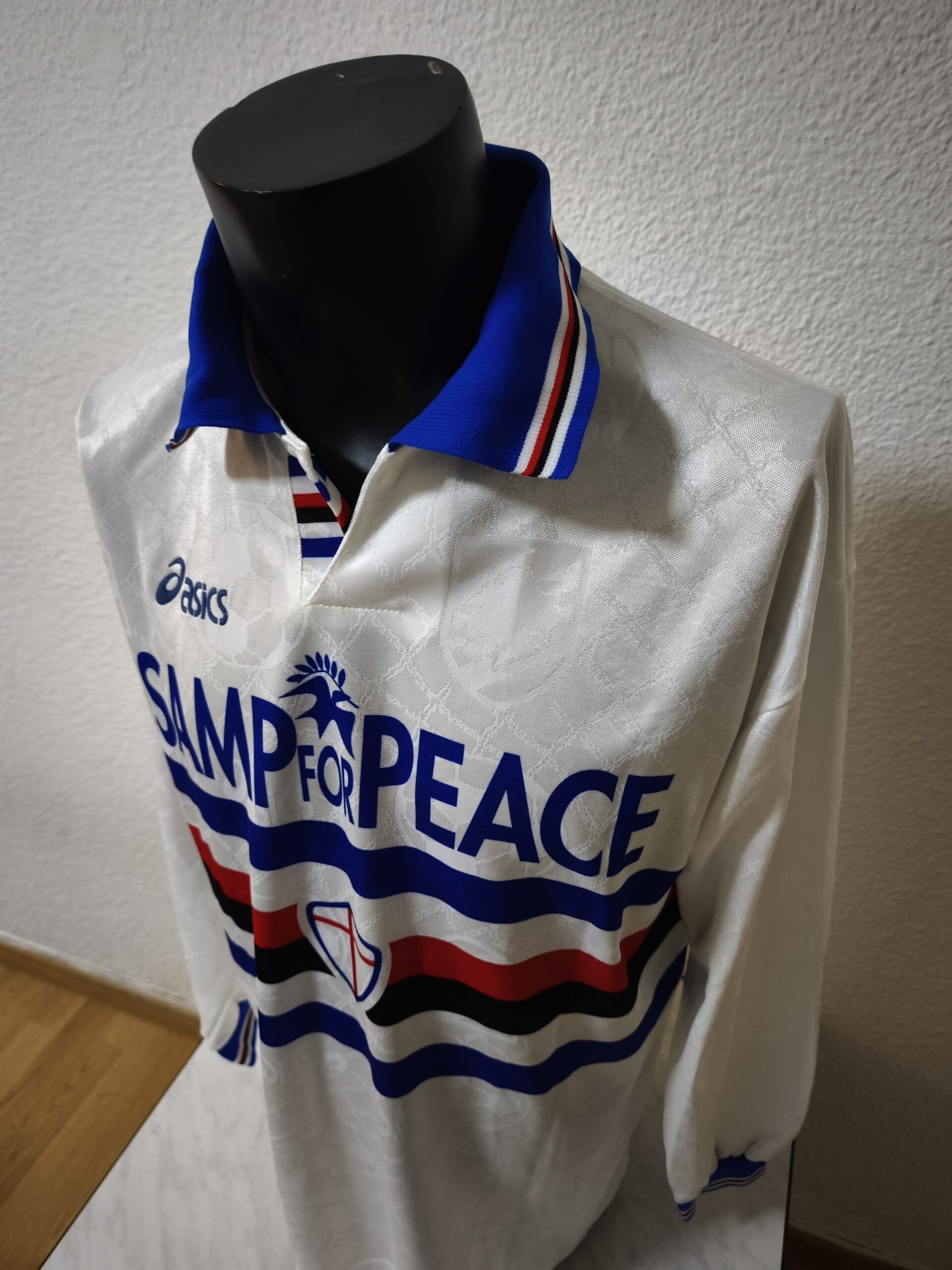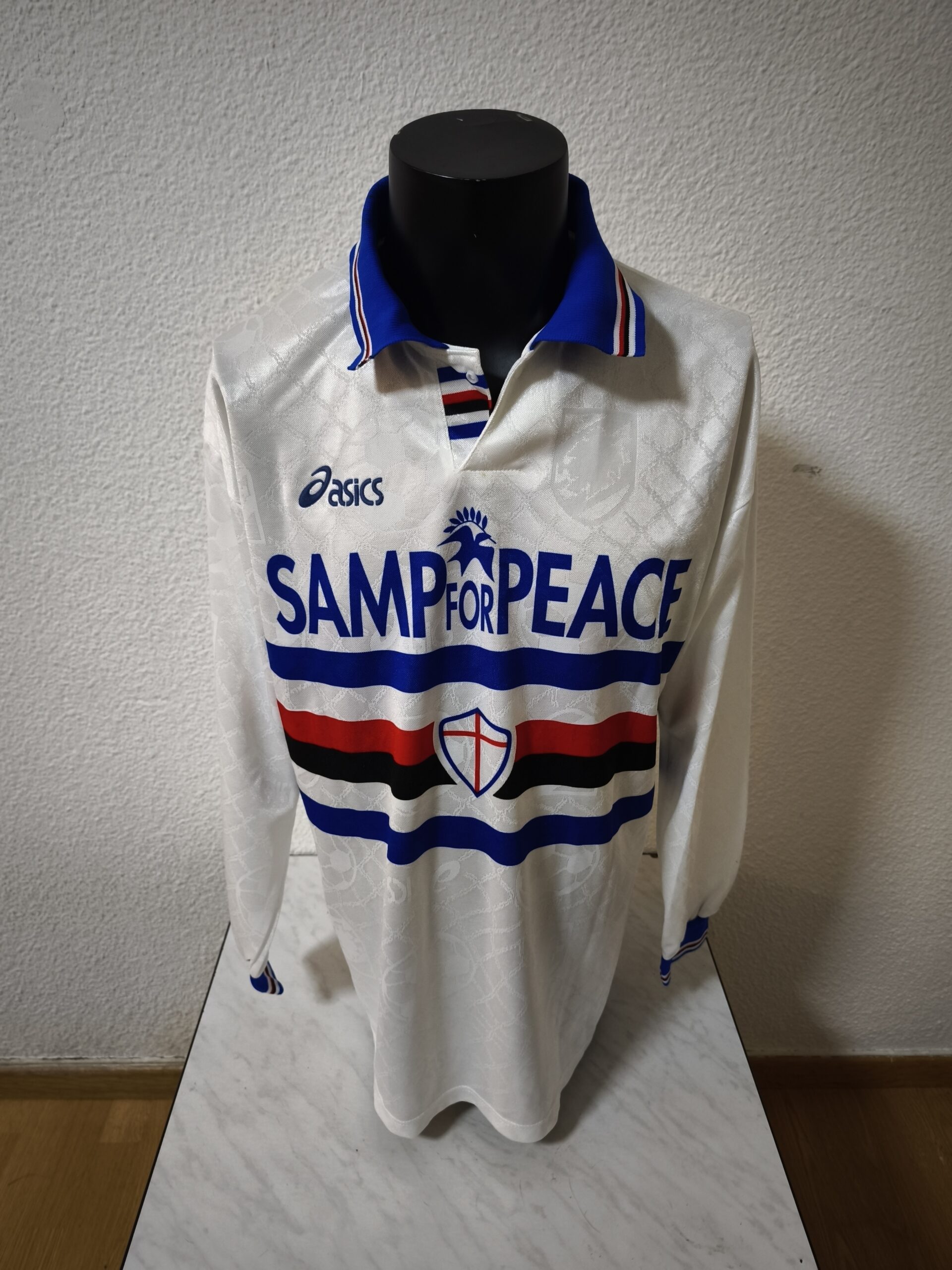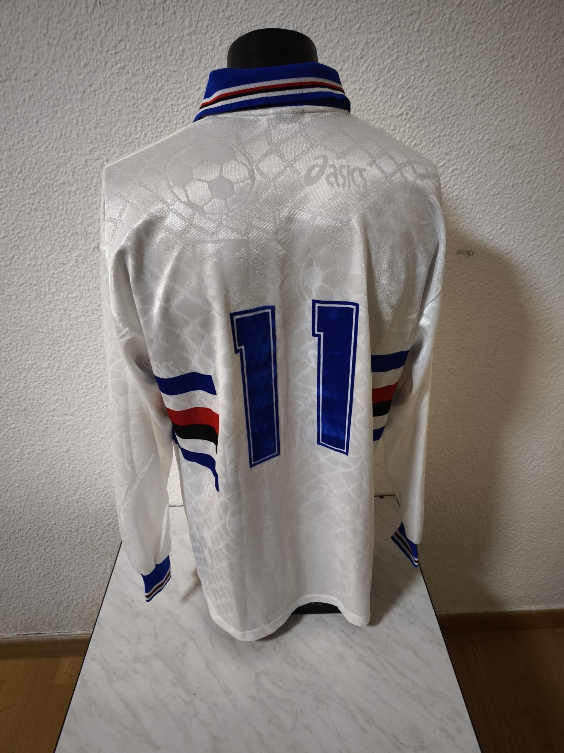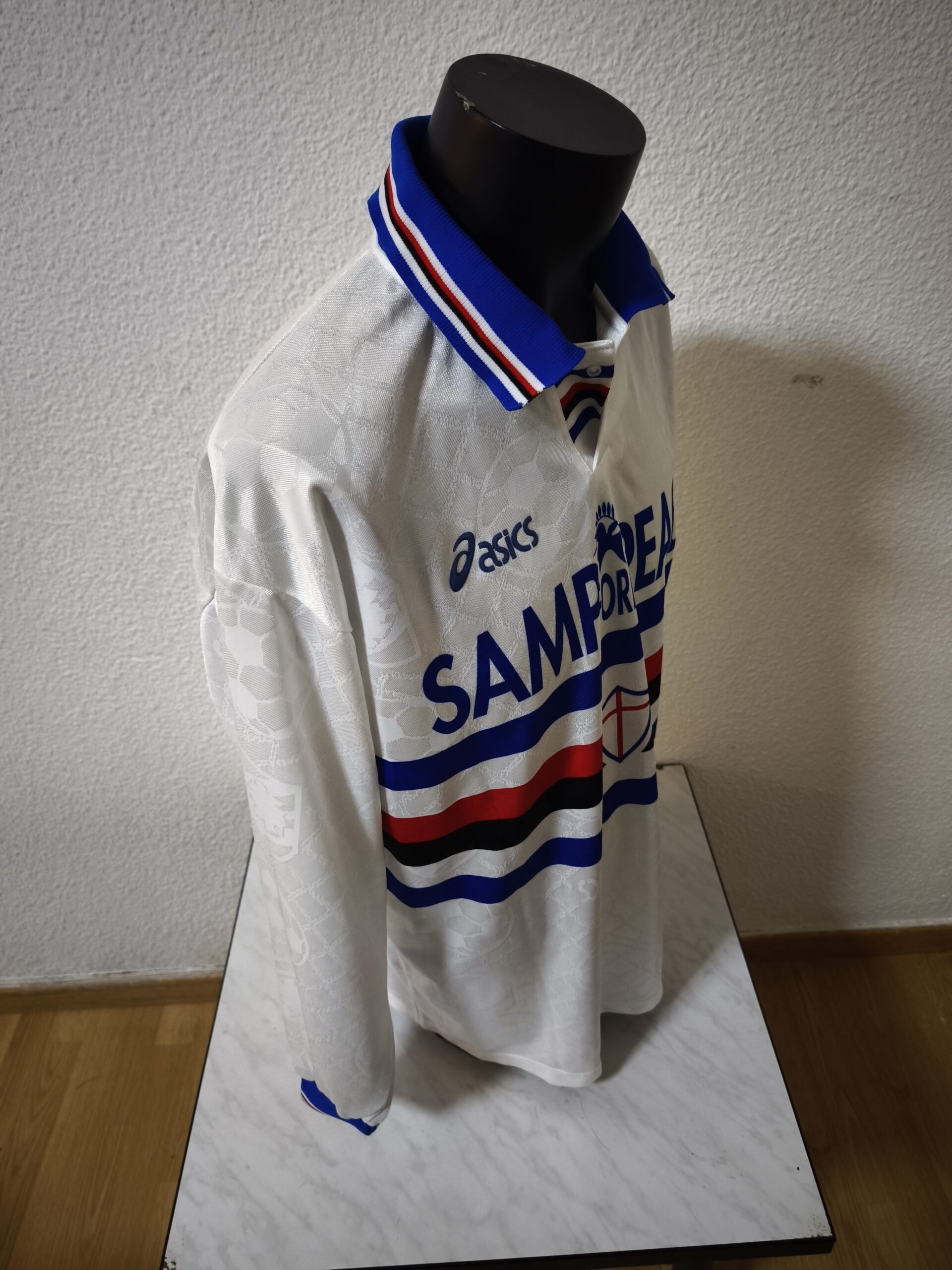 Camiseta visitante de la mítica Sampdoria equipo finalista de la copa de europa del 1992 contra el barcelona, una camiseta espectacular en manga larga de la que me enamoré nada más ver. Numero de terciopelo