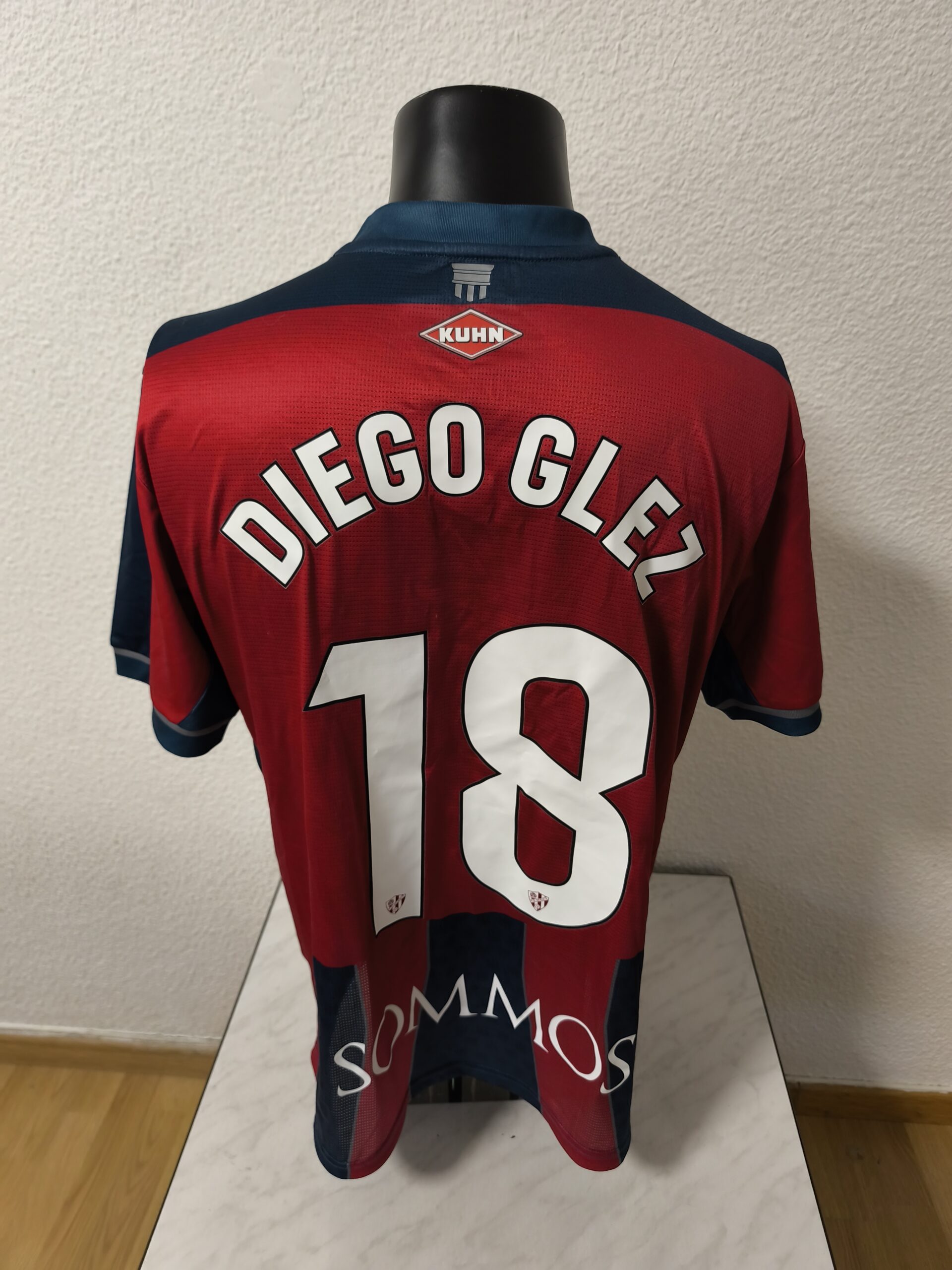 Camiseta primera equipación usada por Diego Gonzalez en su etapa en la SD Huesca, durante la temporada 24/25, el grande de Diego, vino a vernos y se la dio a Nico para que me la diera. Es un tipo top.