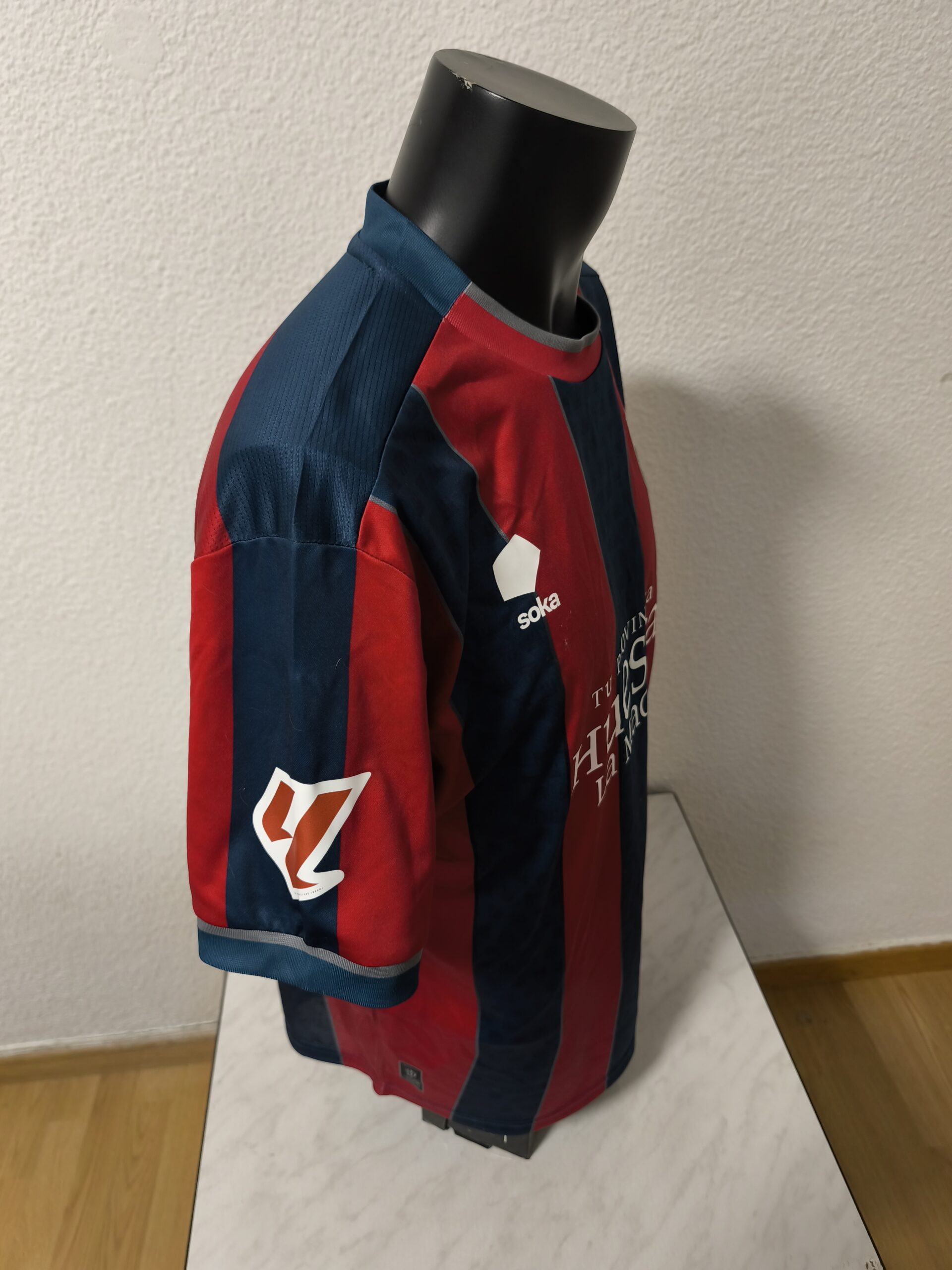 Segunda equipación con la cruz de San Jorge, símbolo de la ciudad del Alto Aragón, con la que disputó su partido de liga de la 23/24 en el estadio Nacional de Andorra. Regalada por don Miguel Loureiro al finalizar el partido.