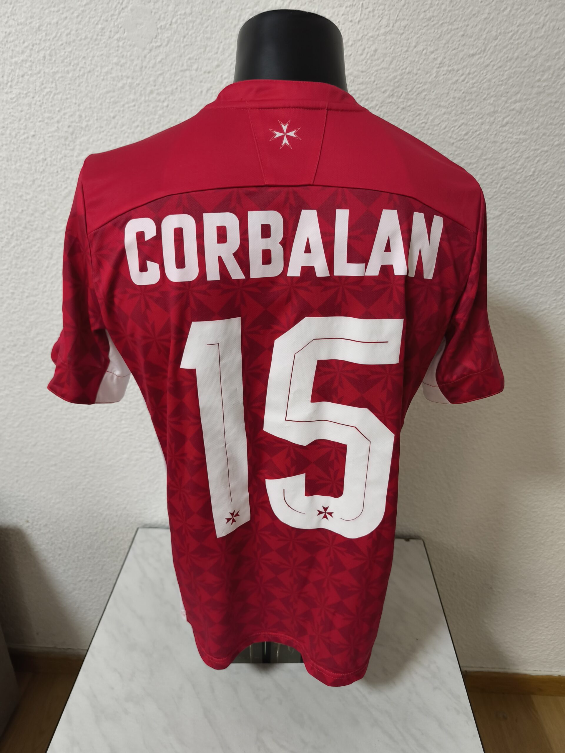 Camiseta traída de Malta, por una persona especial, el señor Jaume Vivó en una de sus vacaciones con la familia, me trajo esta que no fue la primera que me trajo, ya que ha colaborado en diferentes ocasiones. Modelo replica del que usó la selección para la disputa de la fase de clasificación del Mundial de Sudafrica. Me sorprende el tejido brillante de la camiseta.