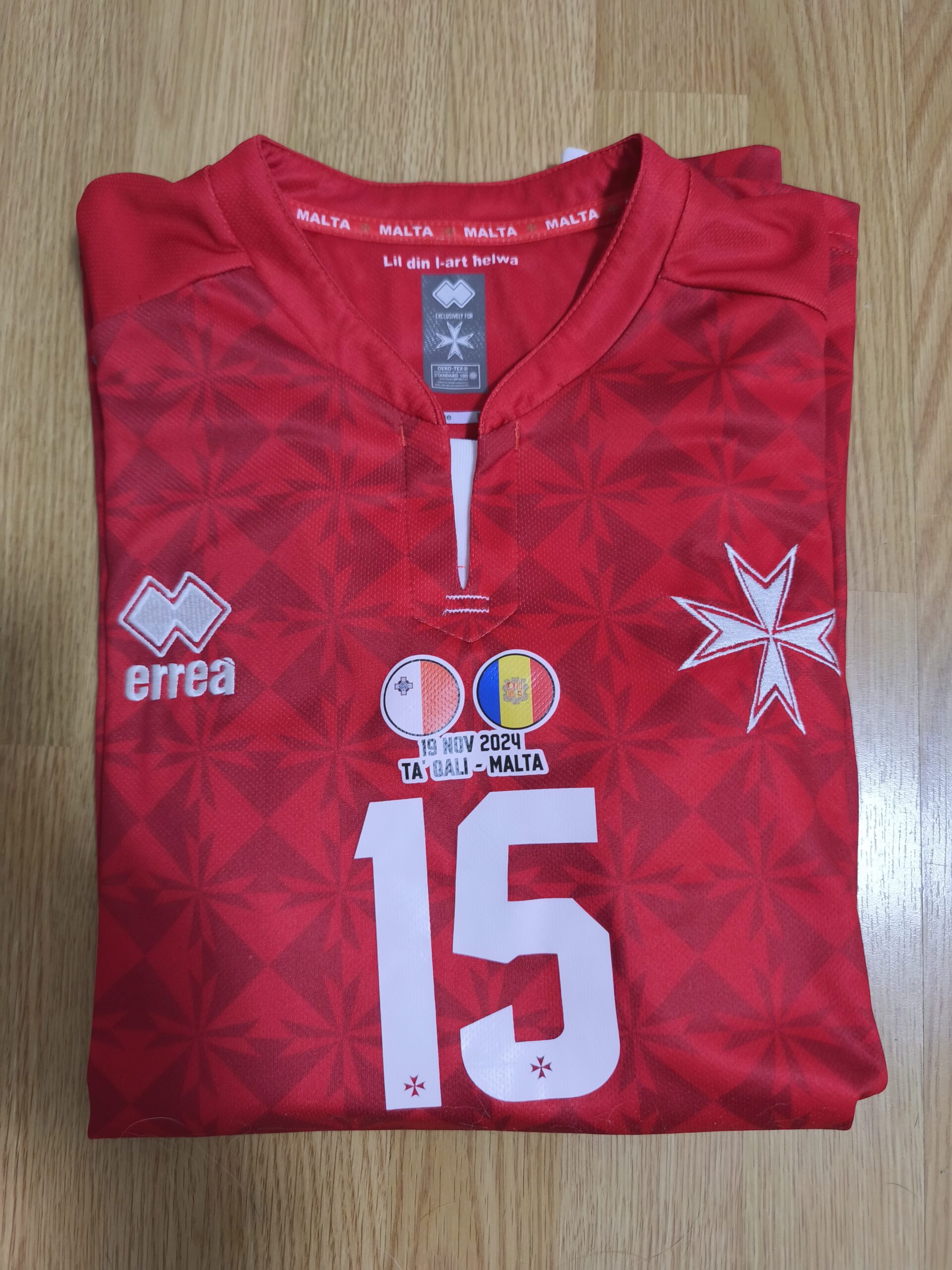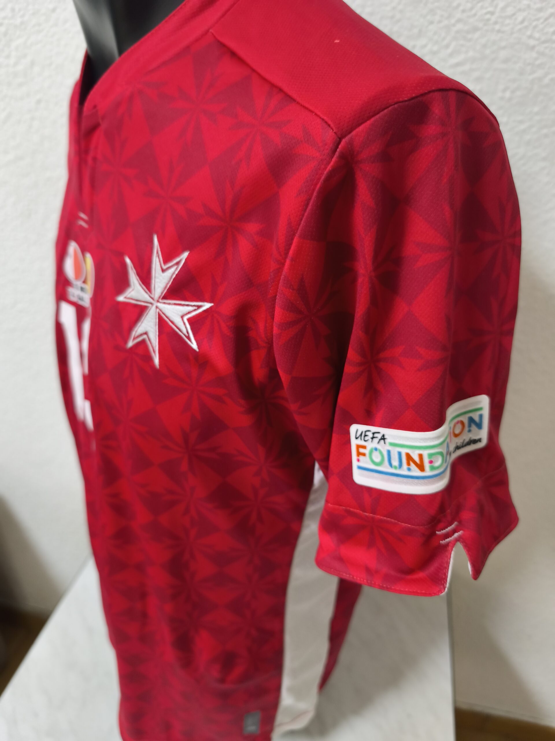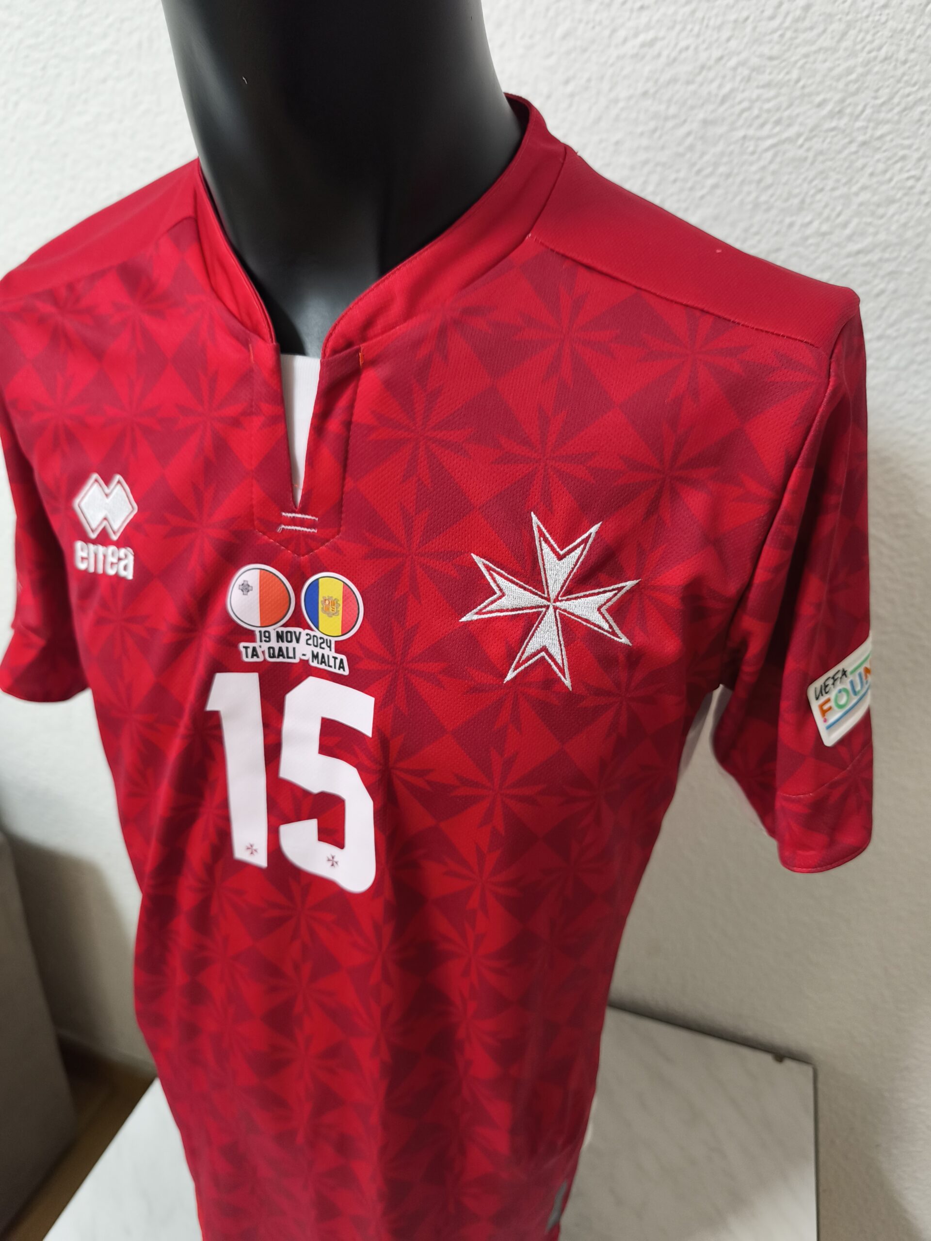 Camiseta usada en el partido de UEFA Nations League, contra la selección de Andorra, disputado en Malta. Conseguida a través de mis amigos de Gol Solidari. Camiseta conmemorativa del 120 años de la Federación Maltesa. Usada por Farrugia.